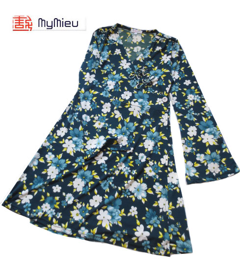■【MyMieu】ブルーグリーン×オフホワ花・ループ花ボタンラップスタイルワンピ(From Vietnam)