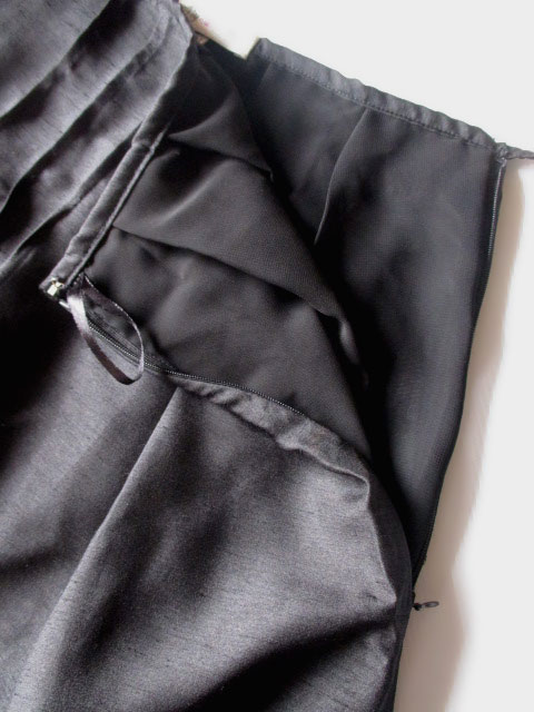 裏地はサラッとした素材感、脱ぎ着はサイドファスナーで、ハンガーにつるす時用の細リボンもついてます。