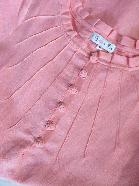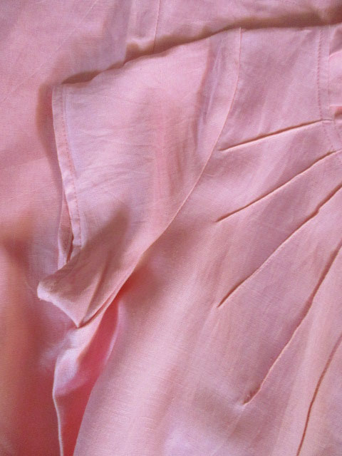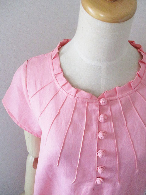 フロントには画像でもしっかり分かっていただけるであろうハンドメイドで丁寧に作られたチャイナノットが6つも並び、放射線状にあしらわれた極々細いタックがより印象的に。