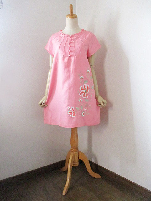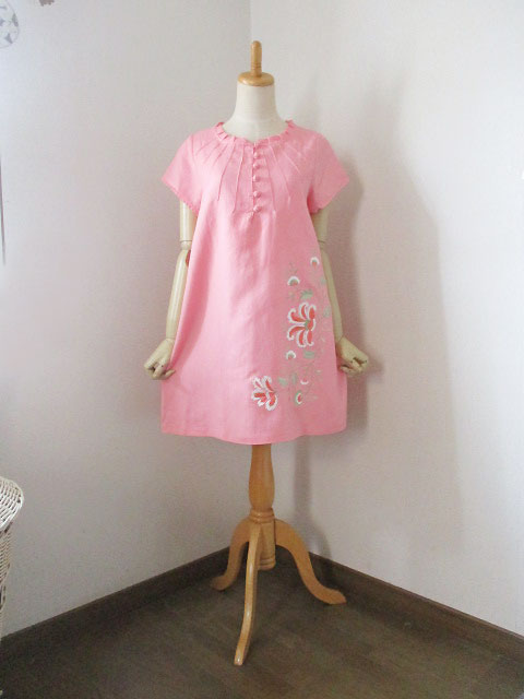 ■中紅花リネン×シノワ大花柄刺繍・チャイナノット細タックフレンチチュニックワンピース **by MyMieu**