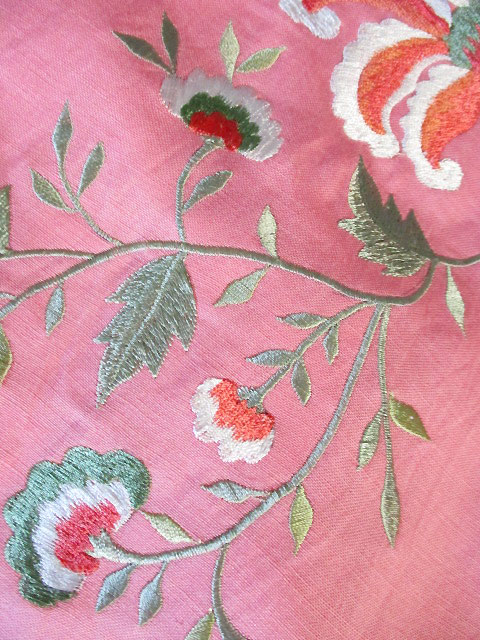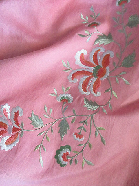 メインにはベースの中紅花色を濃くした「韓紅(からくれない)」の色合いで、少しくすんだ葉の色とともにベースのカラーに上手く溶け込んで大判の刺繍なのにとっても穏やかで優し気です♪