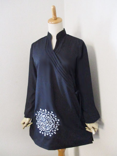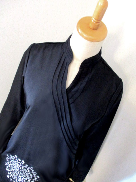 ■ブラック×オフホワ刺繍・タック&カシュクールチュニックワンピース **by MyMieu**
