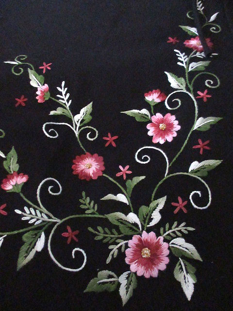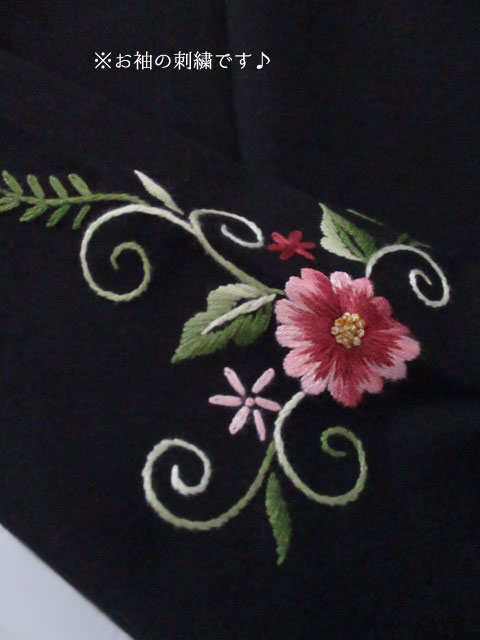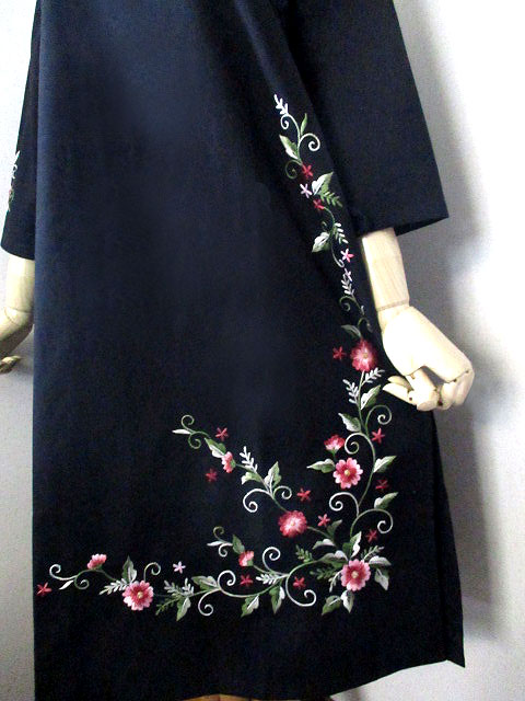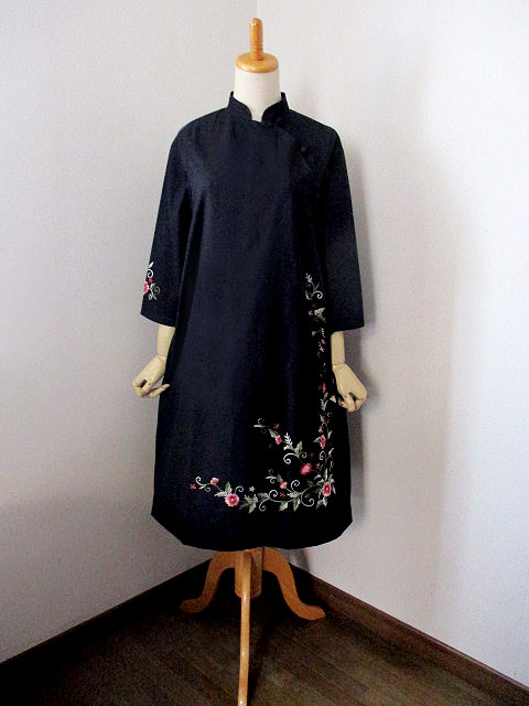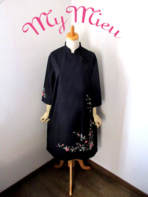 ■ブラックコットン×くすみピンク・ハンド花刺繍チャイナノットワンピース **by MyMieu**