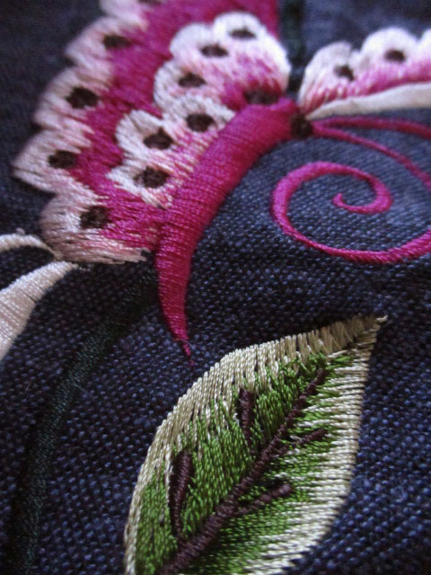 裾には贅沢な牡丹花と蝶々を組み合わせたデザイン刺繍で、その厚み、精度はベトナム刺繍ならでは!
