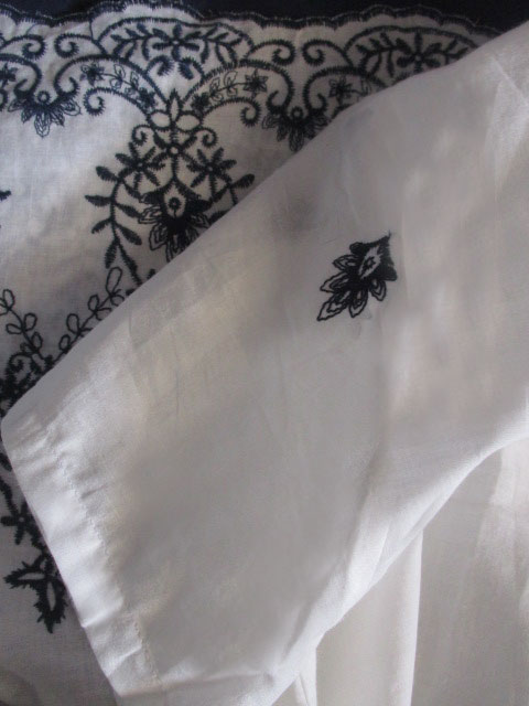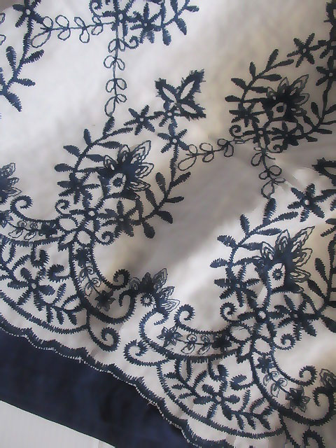 オリエンタルなデザインのモロッカン刺繍は濃紺の刺繍糸を使い、独特の手法でほどけることがありません。裾が刺繍のパイピングに沿ってカットされてるところも◎!