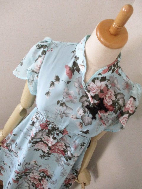 ■レトロブルー×シノワ花シフォン・レイヤー袖シノワボタンギャザースタイルワンピース **by MyMieu**
