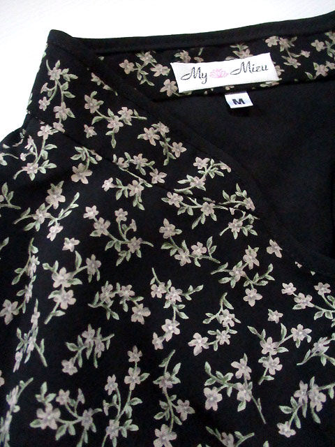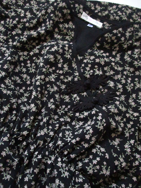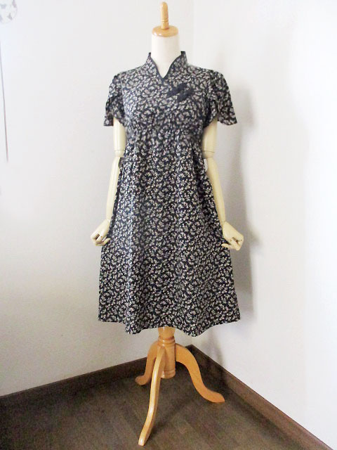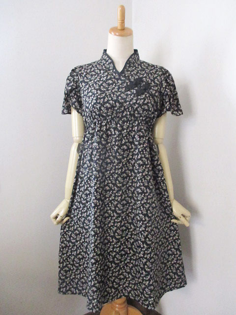 ■ブラック小花柄シフォン・レイヤー袖シノワボタンギャザースタイルワンピース **by MyMieu**