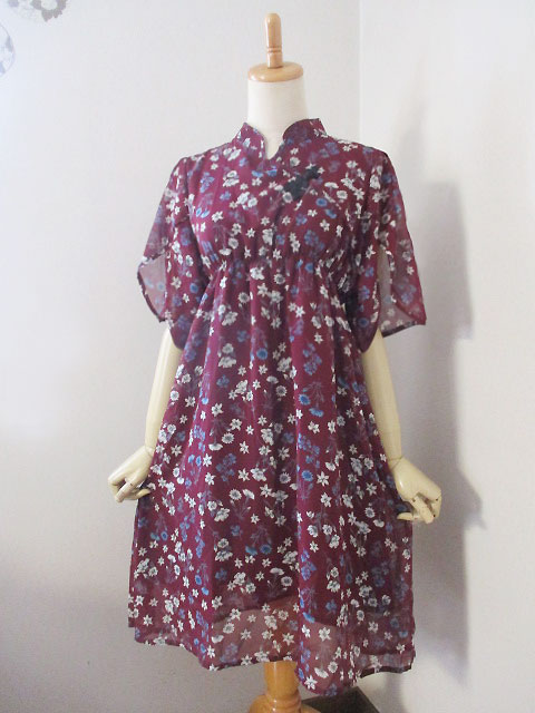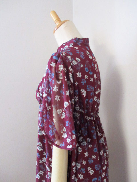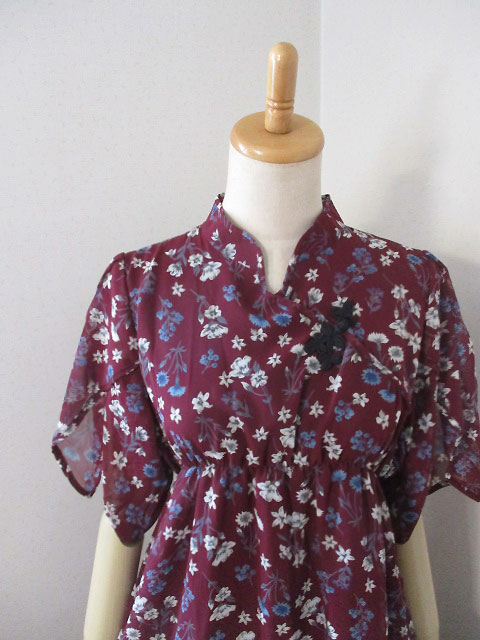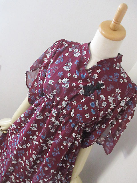 ■臙脂×小花柄シフォン・レイヤー袖シノワボタンギャザースタイルワンピース **by MyMieu**