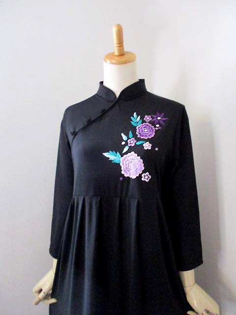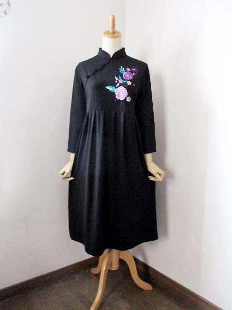 ■桔梗色×総ハンド刺繍・チャイナノットブラックストレッチワンピース **by MyMieu**