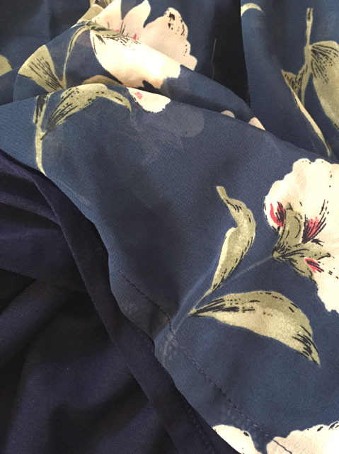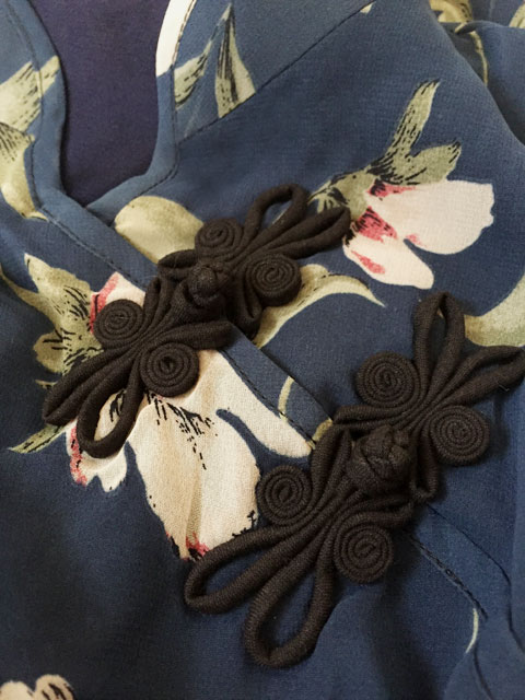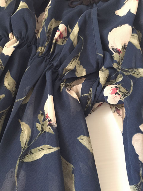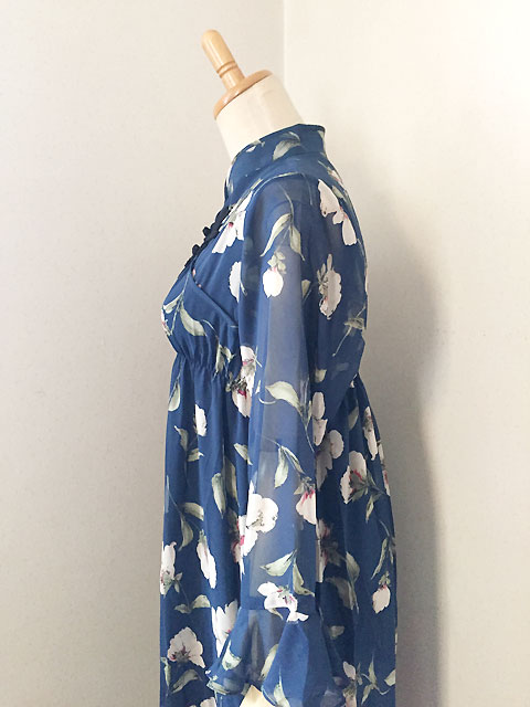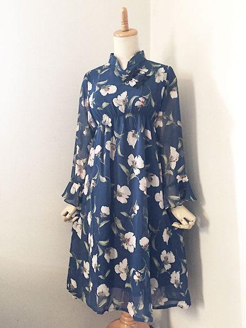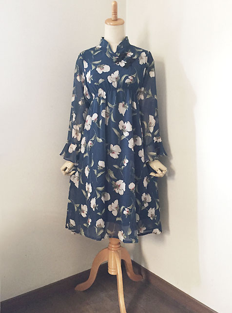 ■ダークブルーシフォン×薄紅藤・シノワ花ボタンギャザースタイルワンピース **by MyMieu**