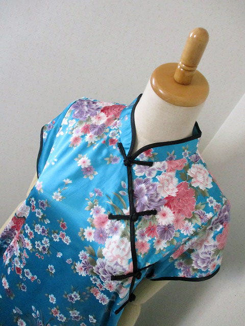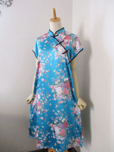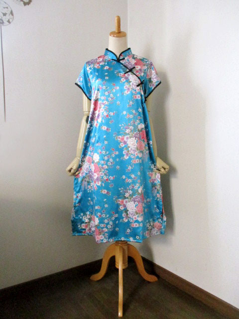 ■サテンブルー×牡丹花デザイン・チャイナストレートボタン上海スタイルワンピース **by MyMieu**