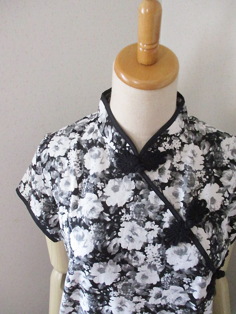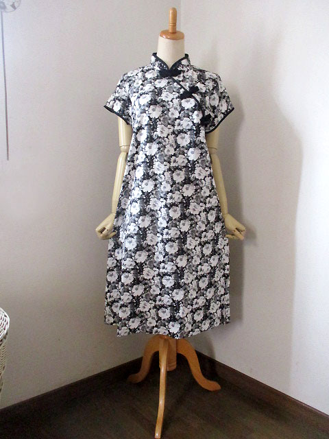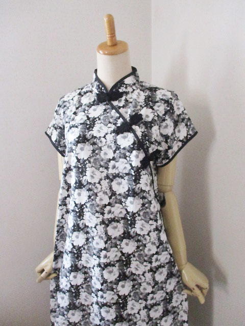 ■ブラックリネン×オフホワ花・シノワ花ボタン上海スタイルワンピース **by MyMieu**