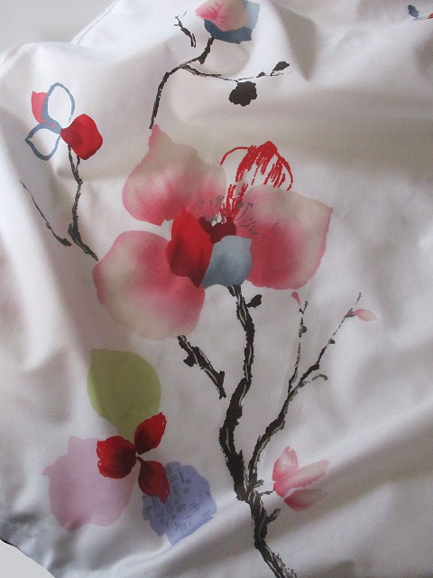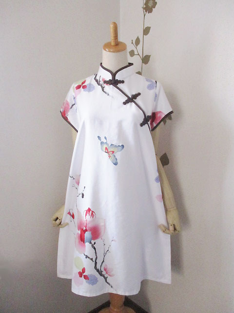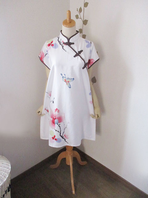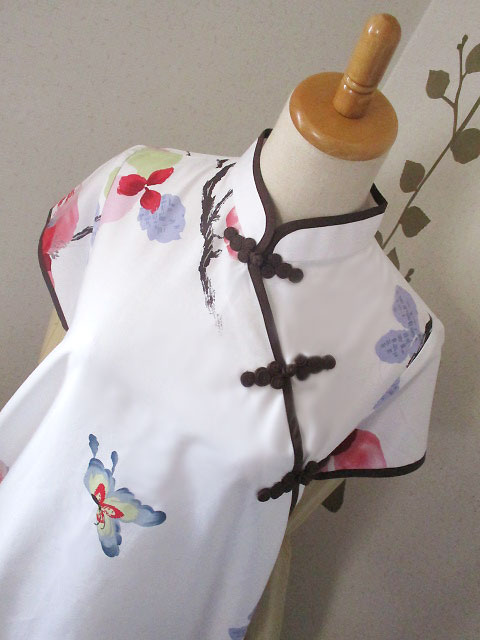 ■オフホワイト×シノワ大花柄・モカ色ボタン上海スタイルワンピース **by MyMieu**