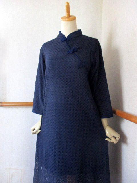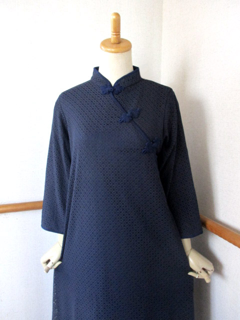 ■紺瑠璃ストレッチ総レース・80%スリーブ上海スタイルワンピース **by MyMieu**
