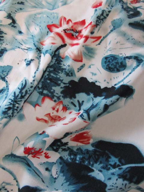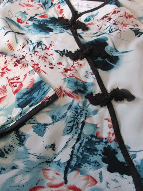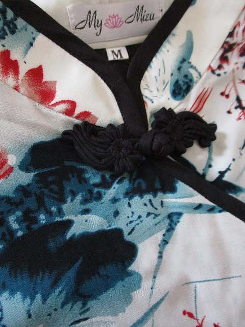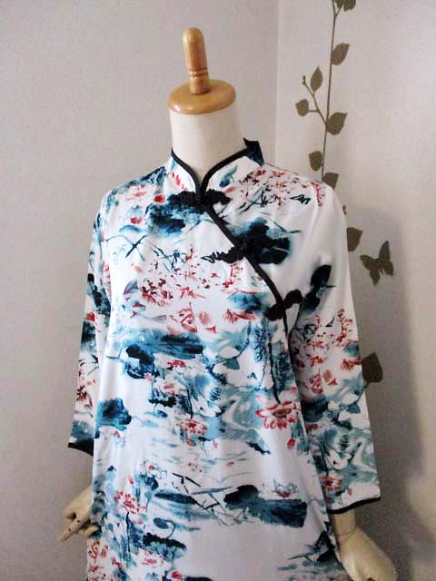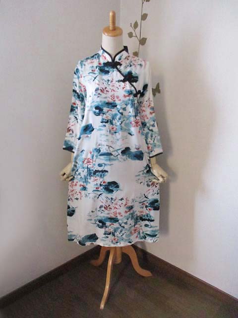 ■オフホワ×水墨画調蓮花デザイン・シノワ花ボタン上海スタイルワンピース **by MyMieu**