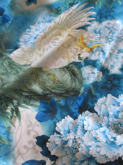 地模様が印象的なオフホワイトから、きれいなグラデーションを描く深みのあるブルー!そして牡丹系の花々!そして!メインに描かれたのはなんと鸚鵡です!
