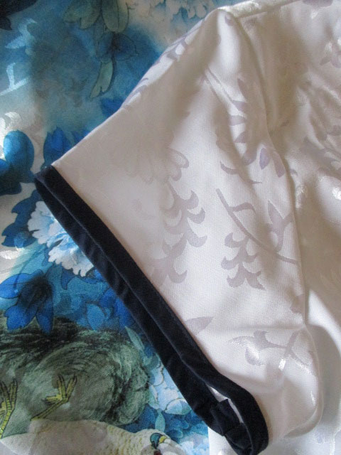 濃いネイビーのパイピング×シノワ花ボタンで全体を引き締め、伝統的モチーフでもある花ボタンはもちろんハンドメイド!