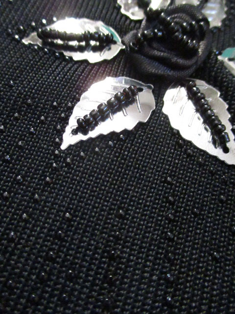 ネックはナチュラルなラインのUネックで、しっかりとしたスパンコールとビーズで縁取り、左サイドにはシルバーの葉っぱのモチーフが印象的なフラワーモチーフが♪