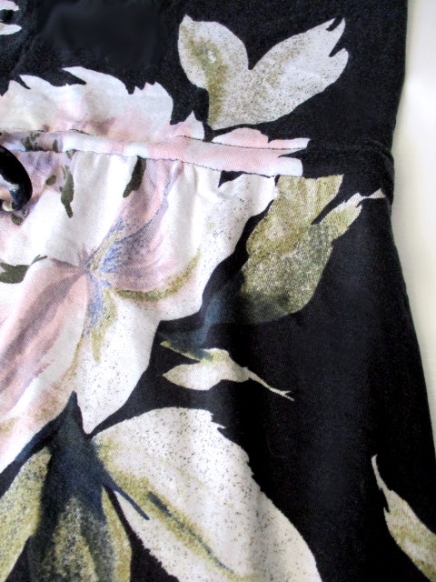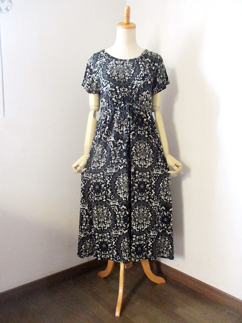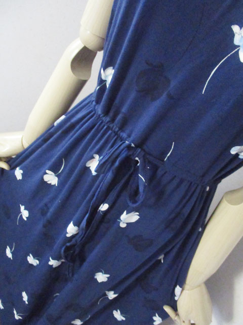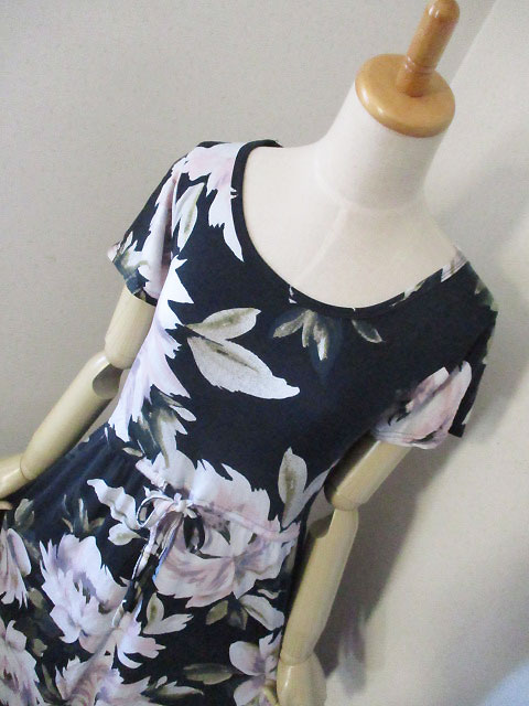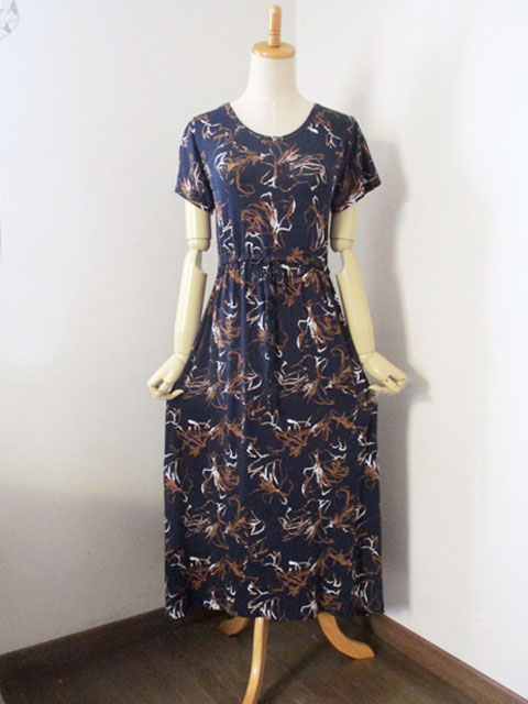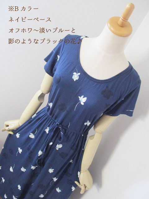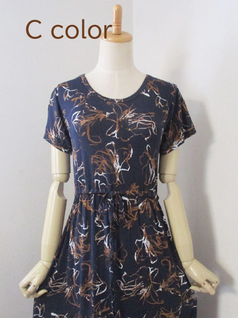 ■ラウンドネック×コットンストレッチ・ウエストギャザー&リボンロング丈ワンピース