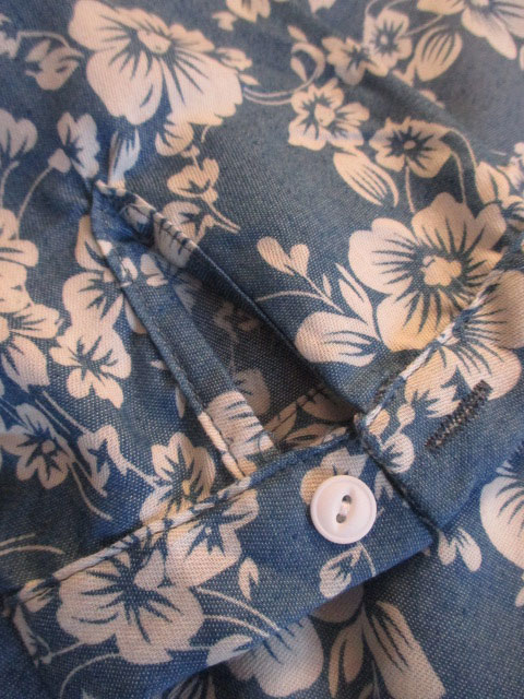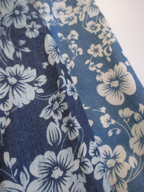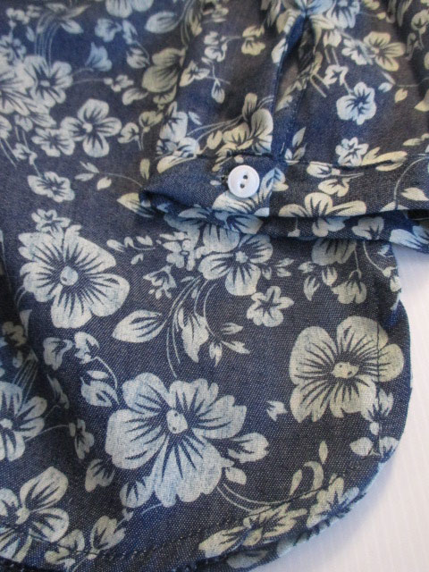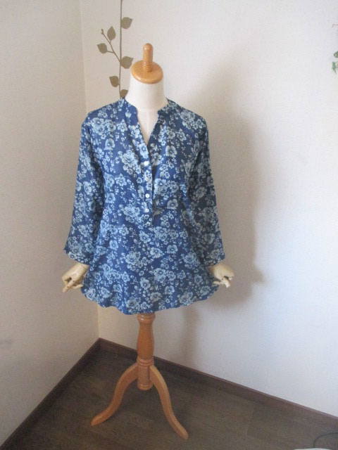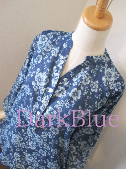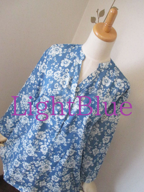 ■デニム調×プルメリア柄・80%スリーブロングチュニック ** CHAYANIS **