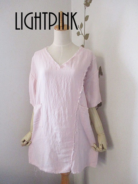 まずトップスのチュニックは切りっぱなしふうデザインがおしゃれなアイテムで、切りっぱなしに見える部分は実は裏側からテープ状の共布を縫い付けてある、という丁寧な作りで、その切りっぱなし部分もほどけたりほつれたりはいたしません!
