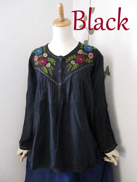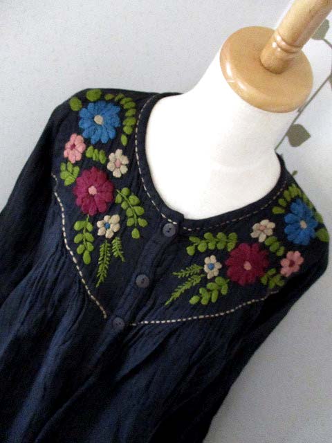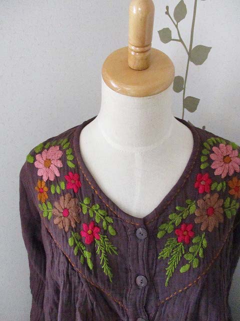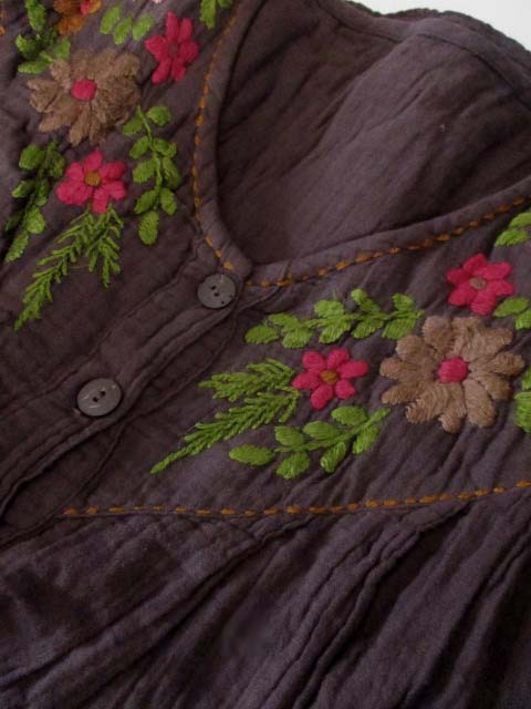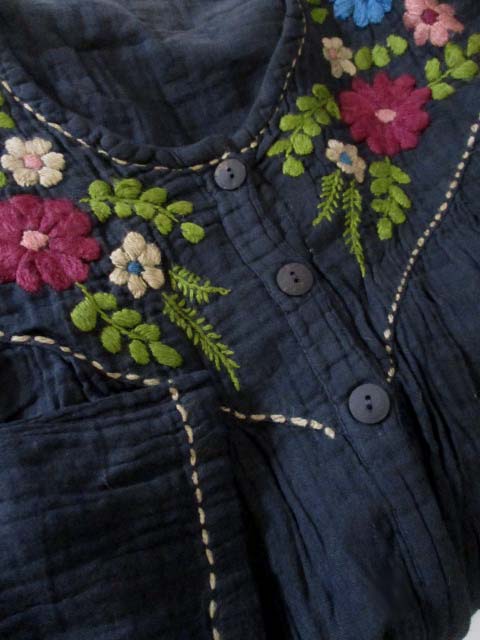 たっぷりと刺繍糸を使った厚みのある花刺繍だけではなく、あしらわれたハンドステッチもかわいらしく、フロントのウッドボタンとともにナチュラルエスニックなおしゃれが楽しめるアイテムです!