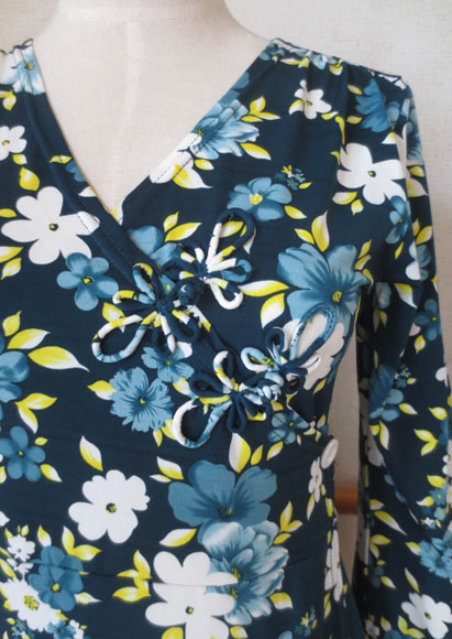 ブルーグリーン×オフホワ花・ループ花ボタンラップスタイルワンピ |