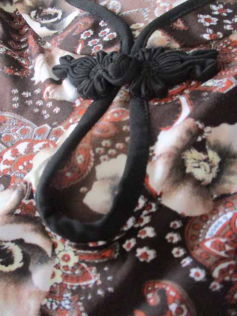 そしてネック〜袖口はブラックのパイピングできゅっと引き締め、フロントのティアドロップ型のホールと、豪華版シノワズリな花ボタンは長い時間をかけてハンドメイドで作られる逸品!