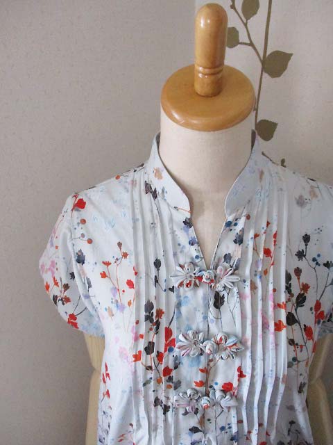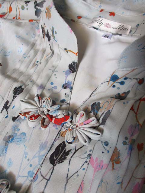 立ち襟から浅めVネックのフロントには、縦に大きめスリットを入れ、ハンドメイドのシノワ花ボタンが3つ。