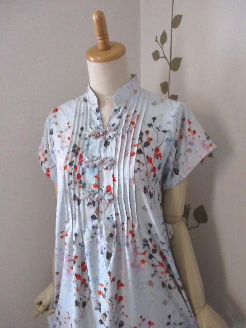 ■薄水色×水中花デザイン・シノワ花ボタンフレンチチュニックワンピース **by MyMieu**