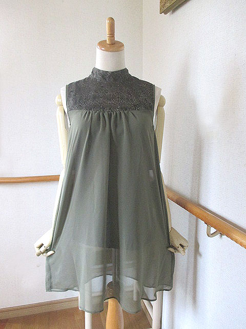 くすみカーキのシフォンにシックでおしゃれなレース使い。カーディガンとの相性◎でレースはストレッチレースなのでとっても着やすいチュニックワンピです!