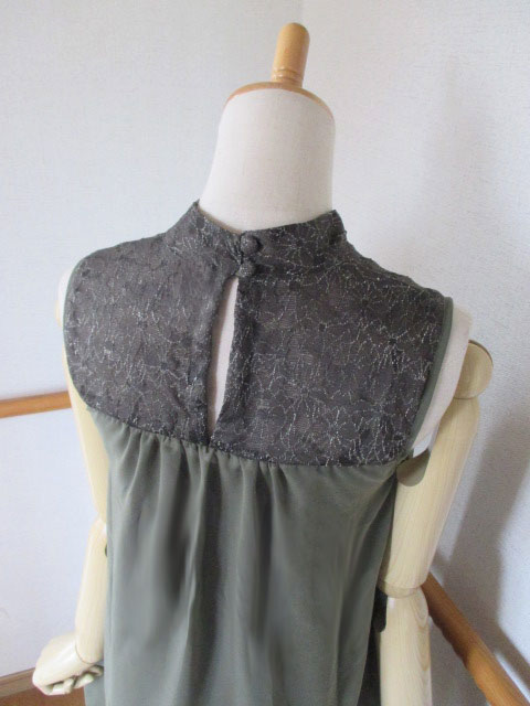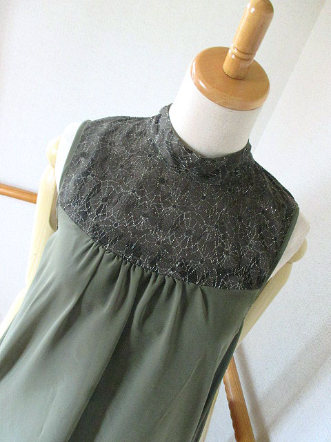 ■ストレッチレース×濃カーキシフォン・スタンドネック切り替えワンピース **by MyMieu**